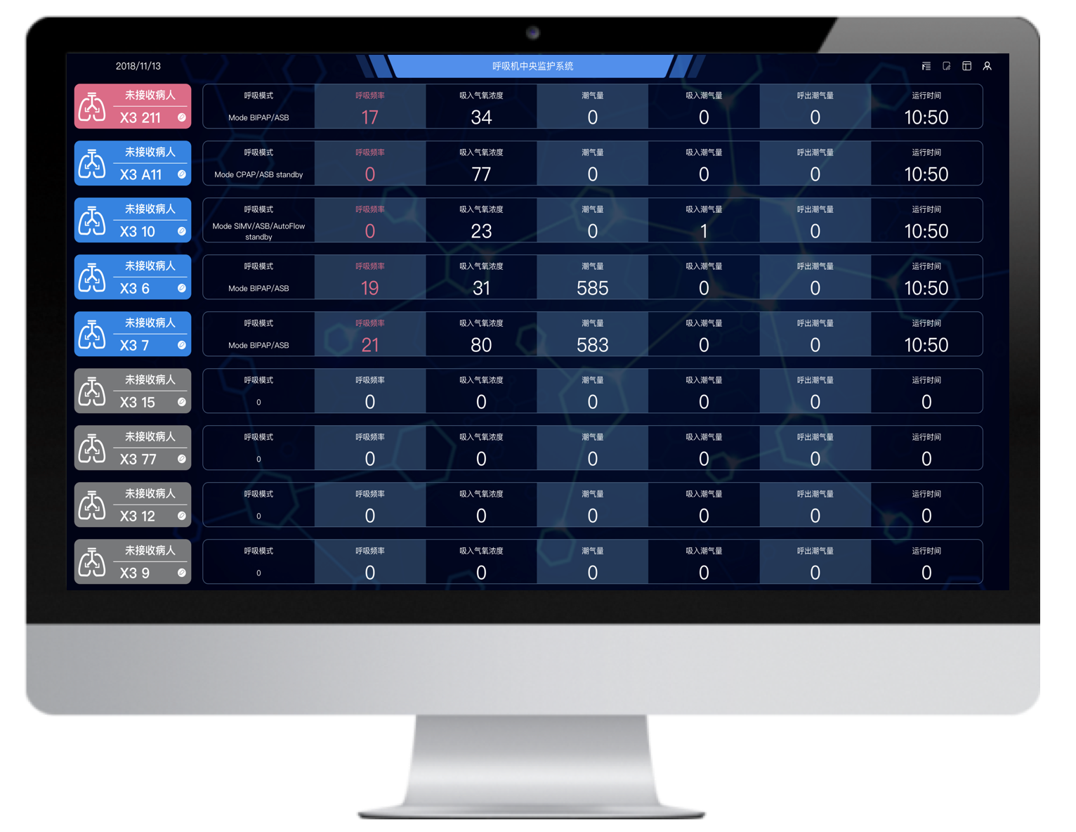 多臺(tái)不同品牌的有創(chuàng)呼吸機(jī)聯(lián)網(wǎng),并通過大屏實(shí)時(shí)集中呈現(xiàn)治療預(yù)設(shè)參數(shù)和監(jiān)測(cè)參數(shù),實(shí)現(xiàn)多臺(tái)集中監(jiān)測(cè)、集中管理和數(shù)據(jù)存儲(chǔ)。